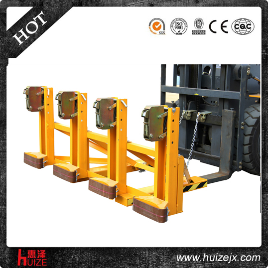 重型四油桶夾單鷹嘴DG2000A純機(jī)械機(jī)構(gòu)設(shè)計(jì)可與叉車方便地配合,僅依靠叉車的動(dòng)作,不需要其它的動(dòng)力,可自動(dòng)一次搬運(yùn)4個(gè)鋼制油桶, 配置可拆換式柔性耐磨保護(hù)墊,有效保護(hù)油桶并緩沖叉車行駛過程中的震動(dòng), 能在集裝箱等這樣狹小的環(huán)境內(nèi)裝卸桶裝物質(zhì),可極大地提高空間利用率, 與貨叉連接配有自鎖裝置確保油桶夾在坡度上和顛簸路面使用時(shí)不會(huì)滑落.